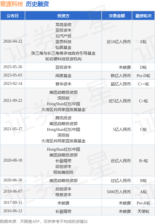 证券之星消息,根据天眼查APP于4月22日公布的信息整理,深圳市普渡科技股份有限公司E轮融资,融资额近10亿人民币,参与投资的机构包括龙岗金控,亚投资本,北汽产投,蓝思科技,弘晖基金,珠三角与长三角等多地政府引导基金,知名硬科技投资机构,投后估值100亿人民币。