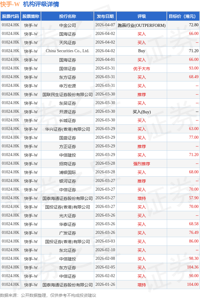 截至2026年4月23日收盘,快手-W(01024.HK)报收于44.14港元,下跌2.65%,成交量4478.41万股,成交额19.84亿港元。投行对该股的评级以买入为主,近90天内共有21家投行给出买入评级,近90天的目标均价为77.12港元。中金公司最新一份研报给予快手-W跑赢行业(OUTPERFORM)评级,目标价72.8港元。