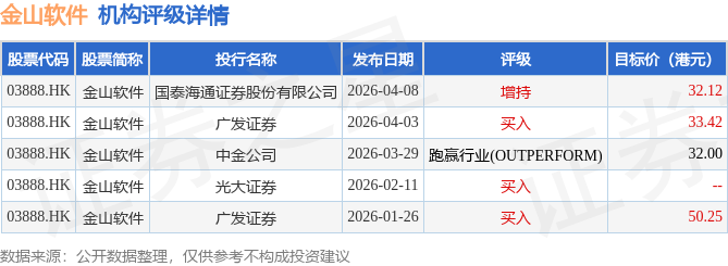 截至2026年4月23日收盘,金山软件(03888.HK)报收于24.28港元,下跌1.22%,成交量709.0万股,成交额1.72亿港元。投行对该股的评级以买入为主,近90天内共有3家投行给出买入评级,近90天的目标均价为36.95港元。国泰海通证券股份有限公司最新一份研报给予金山软件增持评级,目标价32.12港元。