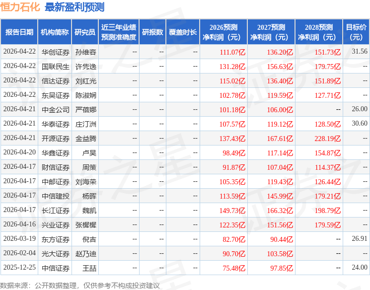 盈利预测和投资建议:根据最新财报及原油波动预期,我们适当微调盈利预测,预计2026年-2028年公司归母净利润分别为116.37、123.04、131.33亿元(2026-2027年原预测值为110.06、127.37亿元),对应EPS分别为1.65、1.75、1.87元,对应PE(以2026年4月23日收盘价计算)分别为14.59倍、13.80倍和12.93倍。我们看好全球炼能重构下公司的龙头属性,维持“买入”评级。