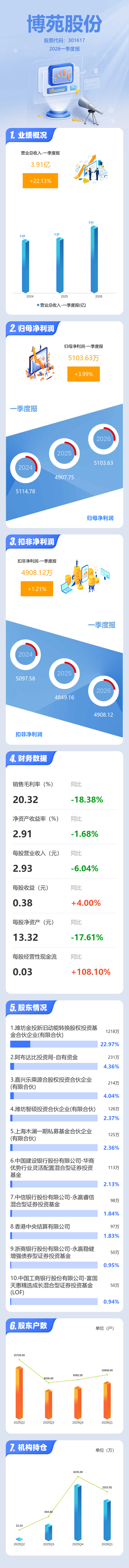 证券之星消息,博苑股份2026年一季报显示,一季度公司主营收入3.91亿元,同比上升22.14%;归母净利润5103.63万元,同比上升3.99%;扣非净利润4908.12万元,同比上升1.22%;负债率9.68%,投资收益171.08万元,财务费用-153.78万元,毛利率20.32%。