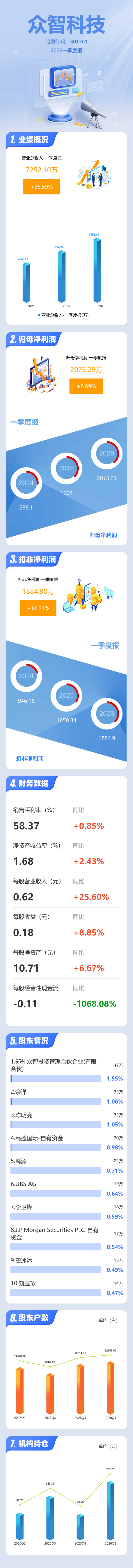 证券之星消息,众智科技2026年一季报显示,一季度公司主营收入7252.1万元,同比上升25.6%;归母净利润2073.29万元,同比上升8.89%;扣非净利润1884.9万元,同比上升14.21%;负债率4.58%,投资收益226.08万元,财务费用-89.54万元,毛利率58.37%。