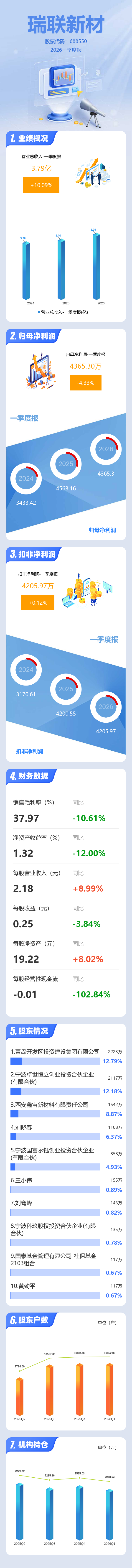 证券之星消息,瑞联新材2026年一季报显示,一季度公司主营收入3.79亿元,同比上升10.1%;归母净利润4365.3万元,同比下降4.34%;扣非净利润4205.97万元,同比上升0.13%;负债率9.61%,投资收益219.81万元,财务费用87.2万元,毛利率37.97%。