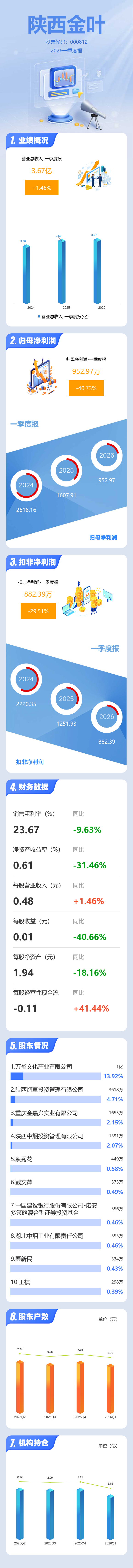 证券之星消息,陕西金叶2026年一季报显示,一季度公司主营收入3.67亿元,同比上升1.47%;归母净利润952.97万元,同比下降40.73%;扣非净利润882.39万元,同比下降29.52%;负债率70.33%,投资收益-28.21万元,财务费用2644.2万元,毛利率23.67%。