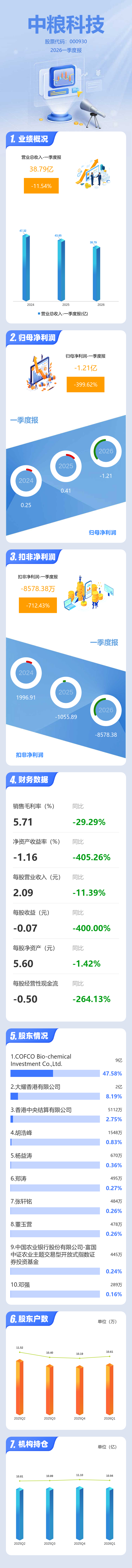 证券之星消息,中粮科技2026年一季报显示,一季度公司主营收入38.79亿元,同比下降11.55%;归母净利润-1.21亿元,同比下降399.62%;扣非净利润-8578.38万元,同比下降712.43%;负债率38.82%,投资收益-2745.41万元,财务费用1602.01万元,毛利率5.71%。