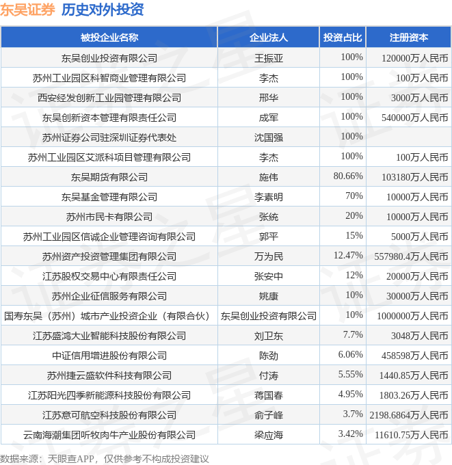 通过天眼查大数据分析,东吴证券股份有限公司共对外投资了38家企业,参与招投标项目851次;财产线索方面有商标信息39条,专利信息12条,著作权信息49条;此外企业还拥有行政许可16个。据2024年报数据,东吴证券商誉3.29亿元,同比增1.2%。长期股权投资22.25亿元,同比增0.68%。
