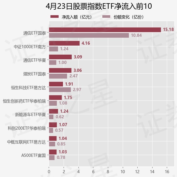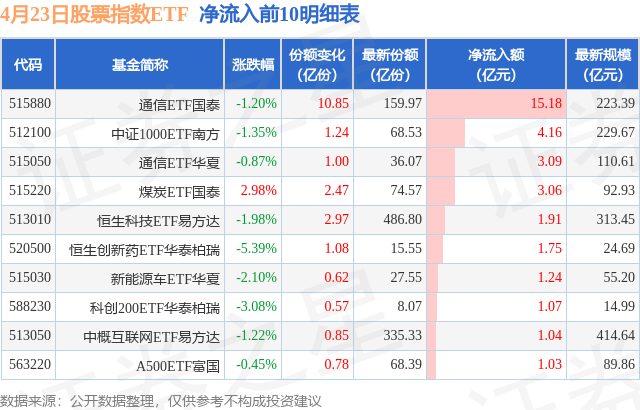 当日有166只股票指数ETF基金出现资金净流入,其中净流入排首位的是通信ETF国泰(515880),份额增加了10.85亿份,净流入额为15.18亿元。