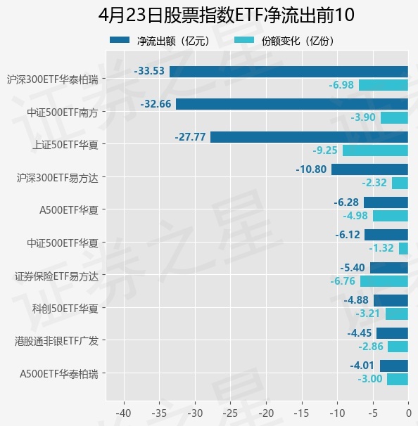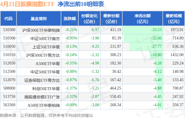 当日有295只股票指数ETF基金出现资金净流出,其中净流出排首位的是沪深300ETF华泰柏瑞(510300),份额减少了6.97亿份,净流出额为33.53亿元。