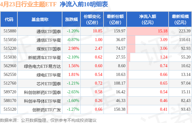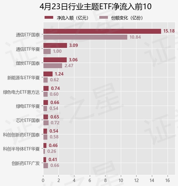 当日有83只行业主题ETF基金出现资金净流入,其中净流入排首位的是通信ETF国泰(515880),份额增加了10.85亿份,净流入额为15.18亿元。