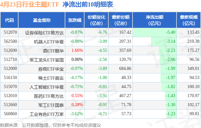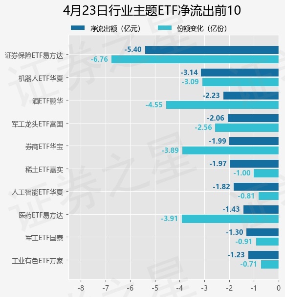 当日有173只行业主题ETF基金出现资金净流出,其中净流出排首位的是证券保险ETF易方达(512070),份额减少了6.76亿份,净流出额为5.4亿元。