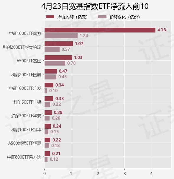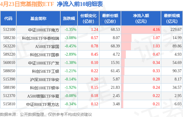 当日有22只宽基指数ETF基金出现资金净流入,其中净流入排首位的是中证1000ETF南方(512100),份额增加了1.24亿份,净流入额为4.16亿元。