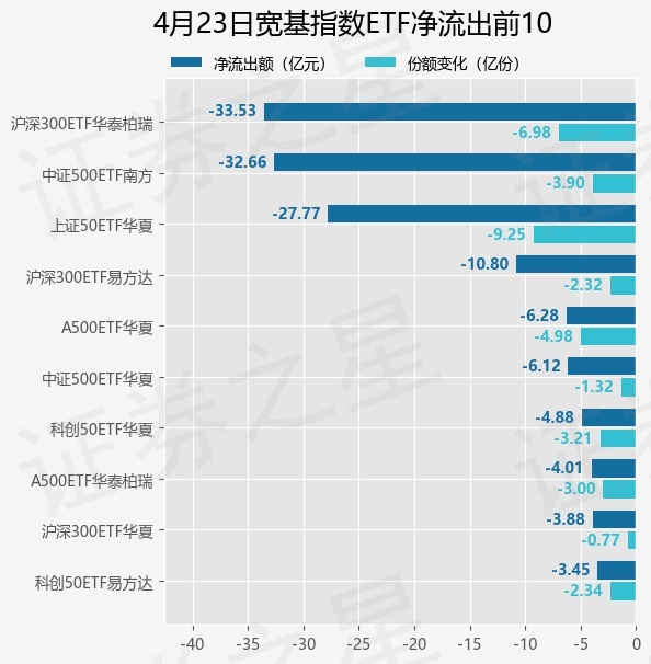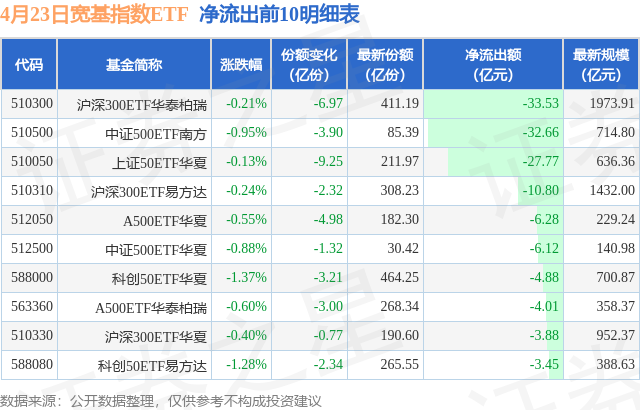 当日有94只宽基指数ETF基金出现资金净流出,其中净流出排首位的是沪深300ETF华泰柏瑞(510300),份额减少了6.97亿份,净流出额为33.53亿元。