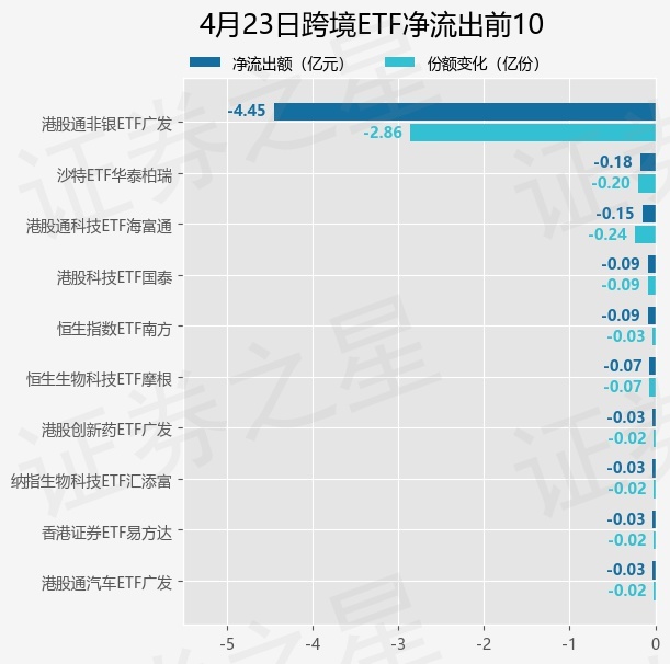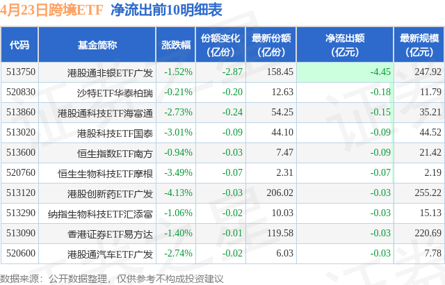 当日有15只跨境ETF基金出现资金净流出,其中净流出排首位的是港股通非银ETF广发(513750),份额减少了2.87亿份,净流出额为4.45亿元。