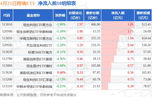 当日有49只跨境ETF基金出现资金净流入,其中净流入排首位的是恒生科技ETF易方达(513010),份额增加了2.97亿份,净流入额为1.91亿元。