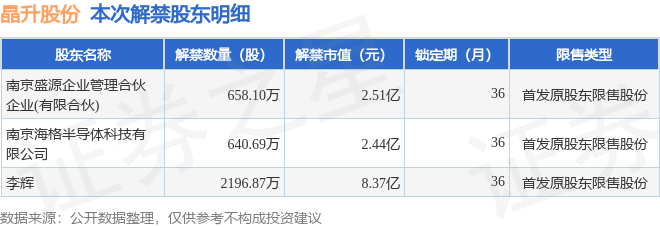 证券之星消息,根据市场公开信息整理,晶升股份(688478)于4月24日将有3495.66万股限售股份解禁,为公司首发原股东限售股份,占公司总股本25.26%。(本次数据根据历史公告整理得出,实际情况以上市公司最新公告为准)最近一年内,该股累计解禁138.37万股,占总股本的1.0%。本次解禁后,公司已无限售股份。具体如下图所示: