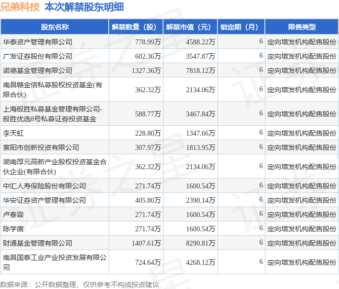 证券之星消息,根据市场公开信息整理,兄弟科技(002562)于4月24日将有7912.14万股限售股份解禁,为公司定向增发机构配售股份,占公司总股本6.92%。(本次数据根据历史公告整理得出,实际情况以上市公司最新公告为准)本次解禁后,公司还有3.29亿股限售股份,占总股本28.81%。具体如下图所示: