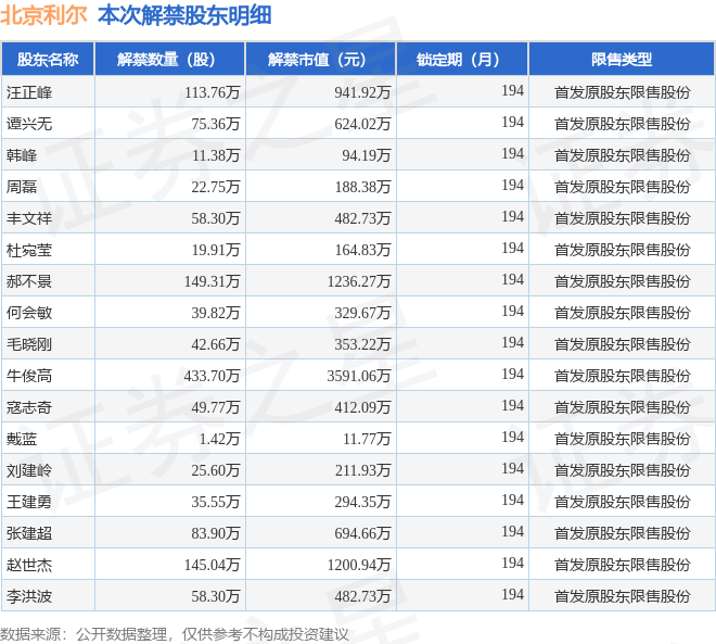 证券之星消息,根据市场公开信息整理,北京利尔(002392)于4月24日将有1366.52万股限售股份解禁,为公司首发原股东限售股份,占公司总股本1.15%。(本次数据根据历史公告整理得出,实际情况以上市公司最新公告为准)最近一年内,该股累计解禁1366.52万股,占总股本的1.15%。本次解禁后,公司还有3294.43万股限售股份,占总股本2.77%。具体如下图所示: