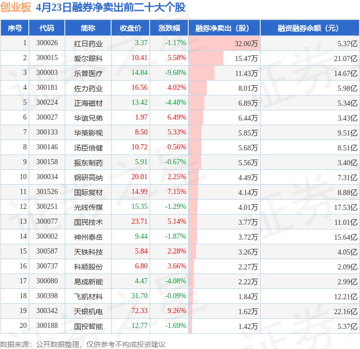 创业板融券净卖出前三分别为:红日药业(300026)融券净卖出32万股、爱尔眼科(300015)融券净卖出15.47万股、乐普医疗(300003)融券净卖出11.43万股,前20具体见下表: