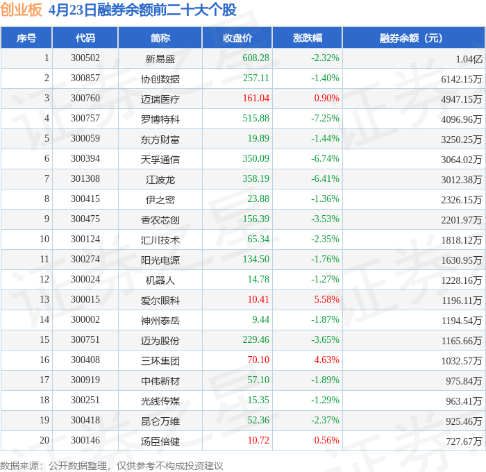 创业板融券余额前三分别为:新易盛(300502)融券余额1.04亿元、协创数据(300857)融券余额6142.15万元、迈瑞医疗(300760)融券余额4947.15万元,前20具体见下表:
