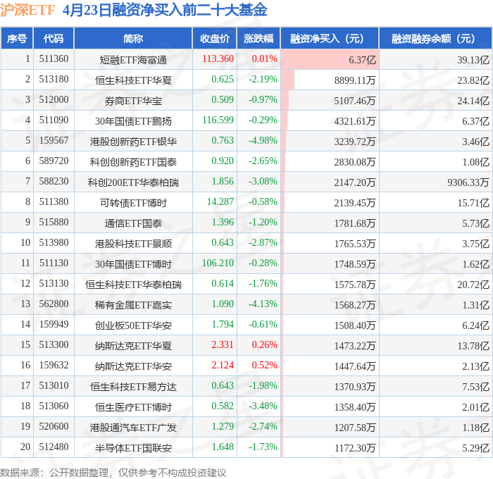 沪深ETF融资净买入前三分别为:短融ETF海富通(511360)融资净买入6.37亿元、恒生科技ETF华夏(513180)融资净买入8899.11万元、券商ETF华宝(512000)融资净买入5107.46万元,前20具体见下表: