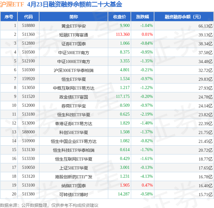 沪深ETF融资融券余额前三分别为:黄金ETF华安(518880)融资融券余额66.13亿元、短融ETF海富通(511360)融资融券余额39.13亿元、证券ETF国泰(512880)融资融券余额38.34亿元,前20具体见下表: