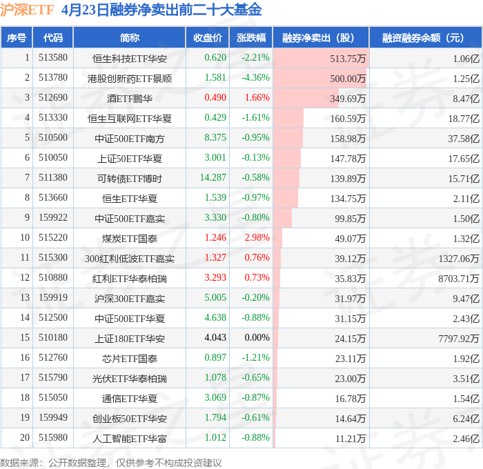 沪深ETF融券净卖出前三分别为:恒生科技ETF华安(513580)融券净卖出513.75万股、港股创新药ETF景顺(513780)融券净卖出500万股、酒ETF鹏华(512690)融券净卖出349.69万股,前20具体见下表: