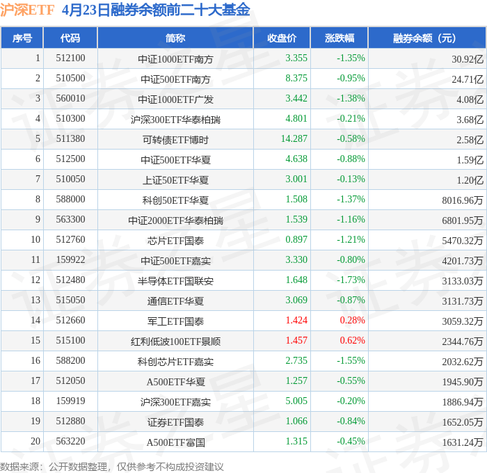 沪深ETF融券余额前三分别为:中证1000ETF南方(512100)融券余额30.92亿元、中证500ETF南方(510500)融券余额24.71亿元、中证1000ETF广发(560010)融券余额4.08亿元,前20具体见下表: