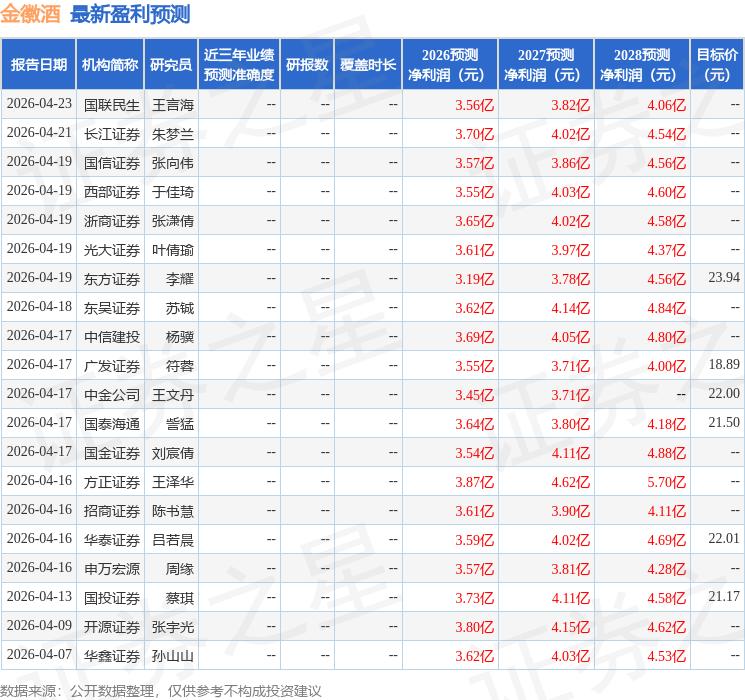 西南证券股份有限公司朱会振,舒尚立近期对金徽酒进行研究并发布了研究报告《2026年一季报点评:26Q1收入表现稳健,省外市场表现亮眼》,给予金徽酒买入评级。