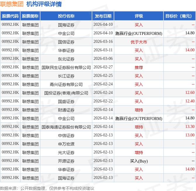 投行对该股的评级以买入为主,近90天内共有11家投行给出买入评级,近90天的目标均价为13.61港元。国海证券最新一份研报给予联想集团买入评级。
