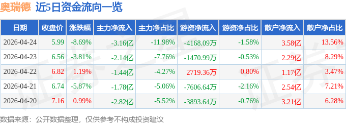 证券之星消息,截至2026年4月24日收盘,奥瑞德(600666)报收于5.99元,下跌8.69%,换手率17.46%,成交量437.02万手,成交额26.4亿元。