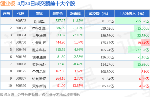 当日创业板成交额前10大个股中4只个股收涨,平均涨幅5.35%,其中新易盛(300502)以成交额501.03亿元排第一。从主力资金流入看,成交额前10大个股中有4只个股呈现主力资金净流入。