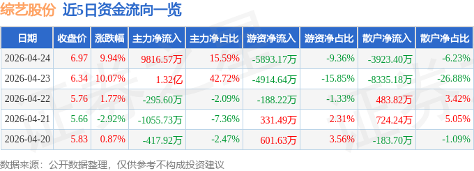 证券之星消息,综艺股份4月24日涨停收盘,收盘价6.97元。该股于9点25分涨停,1次打开涨停,截止收盘封单资金为1.24亿元,占其流通市值1.36%。
