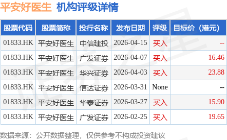 投行对该股的评级以买入为主,近90天内共有5家投行给出买入评级,近90天的目标均价为18.97港元。中信建投最新一份研报给予平安好医生买入评级。
