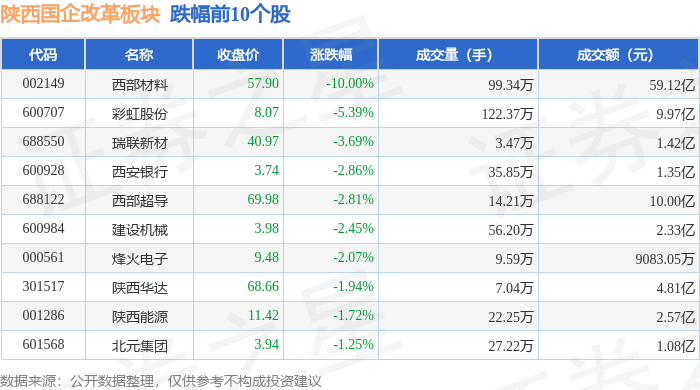 证券之星消息,4月24日陕西国企改革板块较上一交易日下跌0.73%,西部材料领跌。当日上证指数报收于4079.9,下跌0.33%。深证成指报收于14940.3,下跌0.69%。陕西国企改革板块个股涨跌见下表: