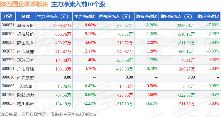 从资金流向上来看,当日陕西国企改革板块主力资金净流出12.44亿元,游资资金净流入9786.61万元,散户资金净流入11.46亿元。陕西国企改革板块个股资金流向见下表: