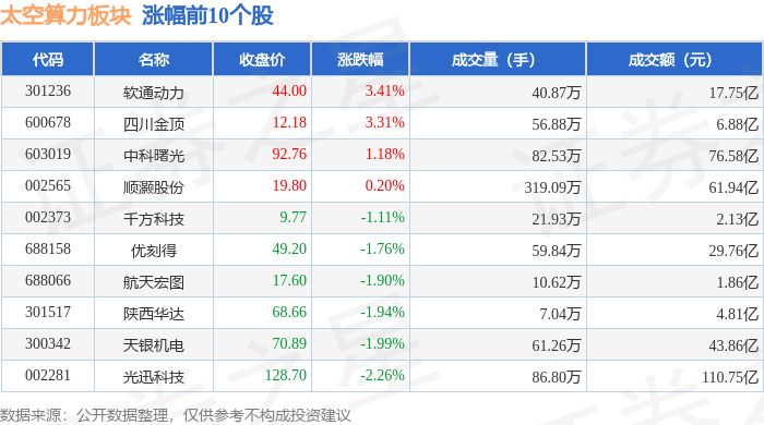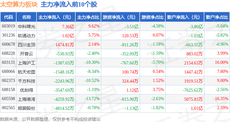 从资金流向上来看,当日太空算力板块主力资金净流出36.97亿元,游资资金净流入5.95亿元,散户资金净流入31.02亿元。太空算力板块个股资金流向见下表: