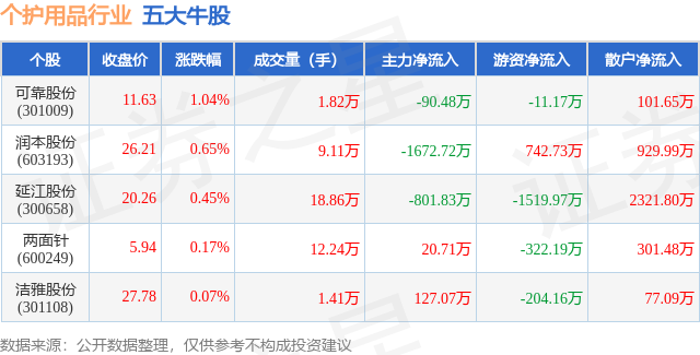 个股表现方面,个护用品行业当日领涨股为可靠股份(301009),该股当日报收11.63,上涨1.04%,成交量1.82万,主力资金净流出90.48万元。润本股份(603193)以上涨0.65%紧随其后,该股当日成交量9.11万,主力资金净流出1672.72万元。除此之外,延江股份(300658)、两面针(600249)、洁雅股份(301108)均进入当日牛股之列。具体个股列表见下表: