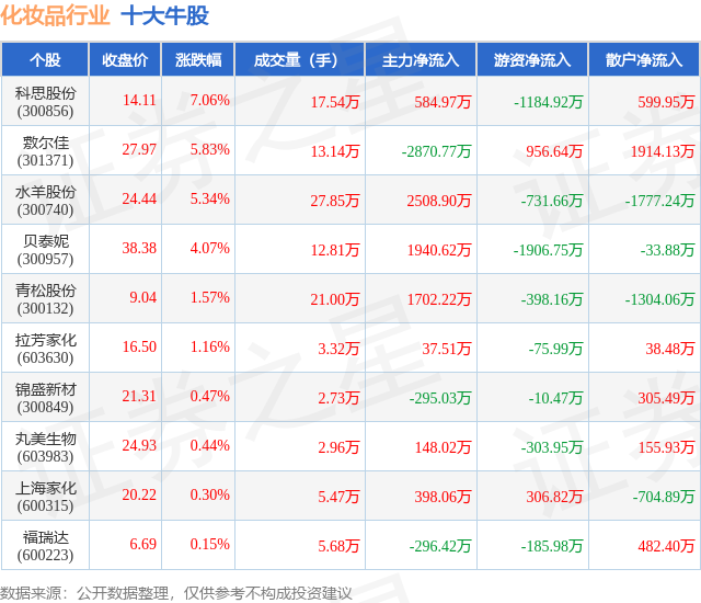 个股表现方面,化妆品行业当日领涨股为科思股份(300856),该股当日报收14.11,上涨7.06%,成交量17.54万,主力资金净流入584.97万元。敷尔佳(301371)以上涨5.83%紧随其后,该股当日成交量13.14万,主力资金净流出2870.77万元。除此之外,水羊股份(300740)、贝泰妮(300957)、青松股份(300132)均进入当日牛股之列。具体个股列表见下表: