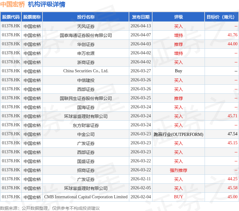 截至2026年4月24日收盘,中国宏桥(01378.HK)报收于36.4港元,上涨2.71%,成交量3296.35万股,成交额11.89亿港元。投行对该股的评级以买入为主,近90天内共有12家投行给出买入评级,近90天的目标均价为44.87港元。天风证券最新一份研报给予中国宏桥买入评级。