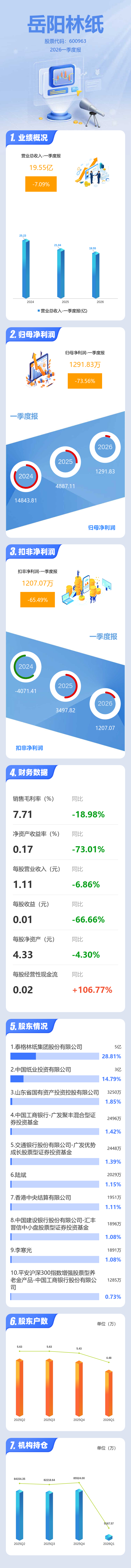 证券之星消息,岳阳林纸2026年一季报显示,一季度公司主营收入19.55亿元,同比下降7.09%;归母净利润1291.83万元,同比下降73.57%;扣非净利润1207.07万元,同比下降65.49%;负债率62.67%,投资收益-282.93万元,财务费用4063.83万元,毛利率7.71%。