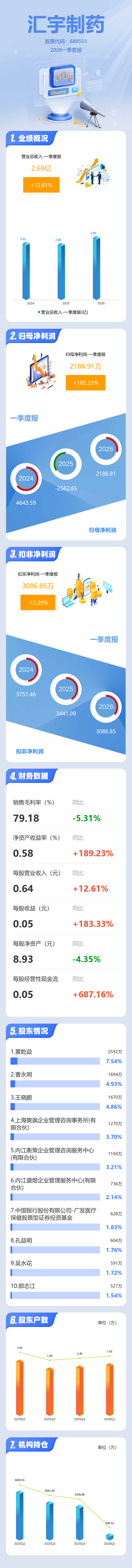 证券之星消息,汇宇制药2026年一季报显示,一季度公司主营收入2.69亿元,同比上升12.61%;归母净利润2186.91万元,同比上升185.34%;扣非净利润3086.85万元,同比下降10.29%;负债率26.5%,投资收益758.46万元,财务费用273.01万元,毛利率79.18%。