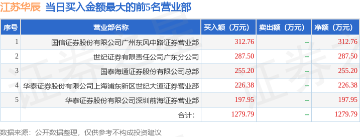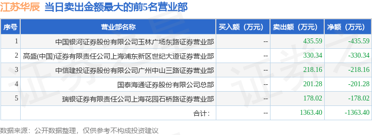 证券之星消息,沪深交易所2026年4月24日公布的交易公开信息显示,江苏华辰(603097)因有价格涨跌幅限制的日收盘价格跌幅偏离值达到7%的前五只证券登上龙虎榜。此次是近5个交易日内第1次上榜。