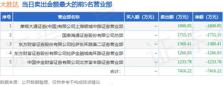 证券之星消息,沪深交易所2026年4月24日公布的交易公开信息显示,大胜达(603687)因有价格涨跌幅限制的日收盘价格跌幅偏离值达到7%的前五只证券登上龙虎榜。此次是近5个交易日内第1次上榜。