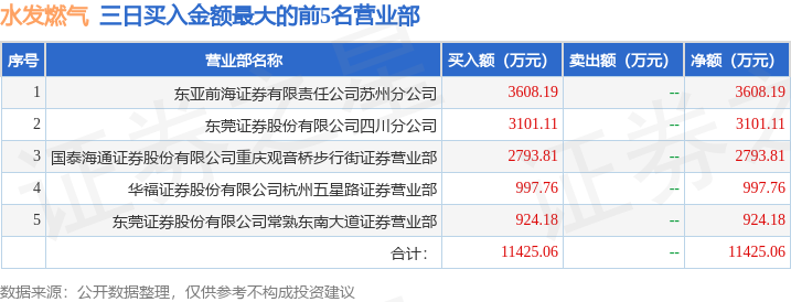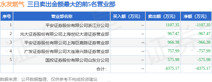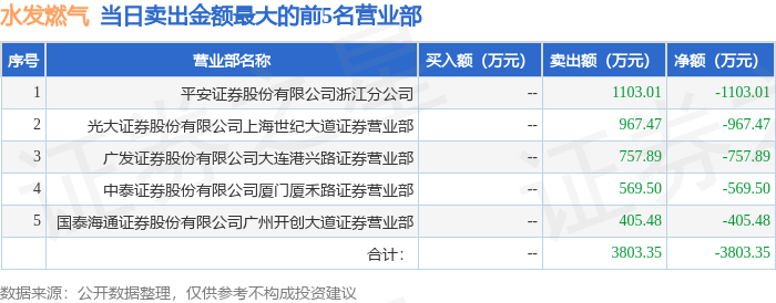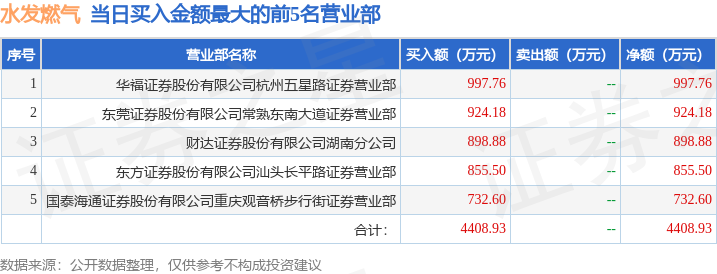 证券之星消息,沪深交易所2026年4月24日公布的交易公开信息显示,水发燃气(603318)因有价格涨跌幅限制的日收盘价格涨幅偏离值达到7%的前五只证券,非ST、*ST和S证券连续三个交易日内收盘价格涨幅偏离值累计达到20%的证券登上龙虎榜。此次是近5个交易日内第2次上榜。