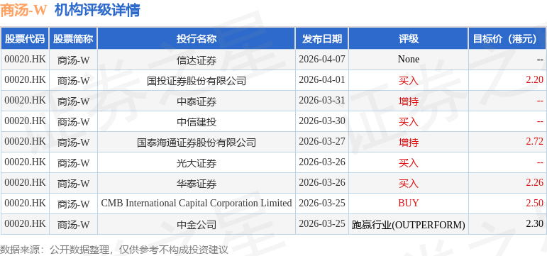 截至2026年4月24日收盘,商汤-W(00020.HK)报收于2.03港元,上涨1.5%,成交量3.35亿股,成交额6.68亿港元。投行对该股的评级以买入为主,近90天内共有4家投行给出买入评级,近90天的目标均价为2.4港元。信达证券最新一份研报给予商汤-WNone评级。