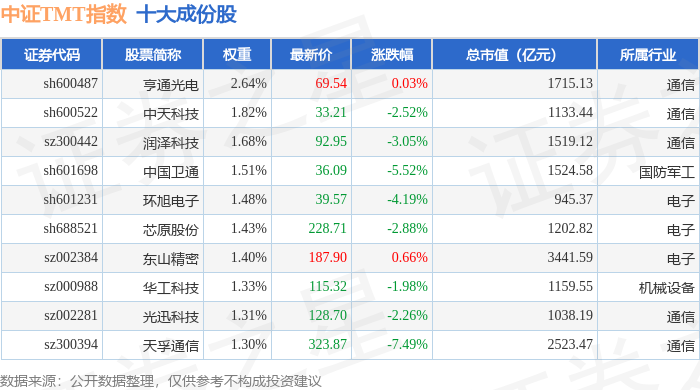 中证TMT(000998)指数十大成份股详情如下: