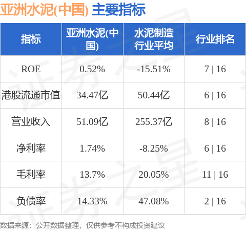 亚洲水泥(中国)港股市值34.47亿港元,在水泥制造行业中排名第6。主要指标见下表: