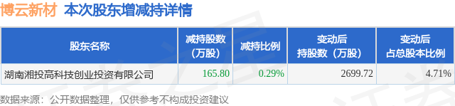 证券之星消息,4月24日博云新材发布公告《博云新材:关于股东减持股份计划实施完成的公告》,其股东湖南湘投高科技创业投资有限公司于2026年4月23日合计减持165.8万股,占公司目前总股本的0.2893%,变动期间该股股价上涨9.61%,截止4月23日收盘报22.24元。