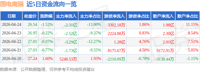 证券之星消息,截至2026年4月24日收盘,国电南瑞(600406)报收于26.54元,下跌1.52%,换手率0.83%,成交量66.68万手,成交额17.8亿元。