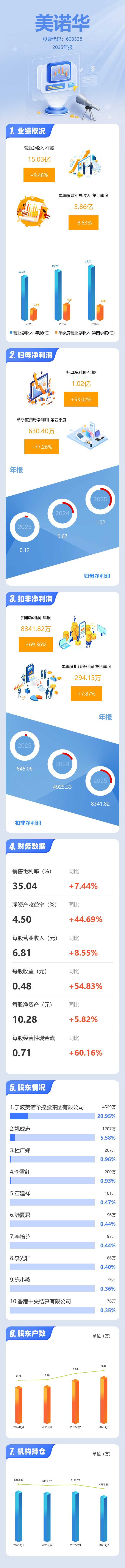 证券之星消息,美诺华2025年年报显示,当年度公司主营收入15.03亿元,同比上升9.49%;归母净利润1.02亿元,同比上升53.02%;扣非净利润8341.82万元,同比上升69.37%;其中2025年第四季度,公司单季度主营收入3.86亿元,同比下降8.84%;单季度归母净利润630.4万元,同比上升77.26%;单季度扣非净利润-294.15万元,同比上升7.88%;负债率49.49%,投资收益731.55万元,财务费用3654.42万元,毛利率35.04%。